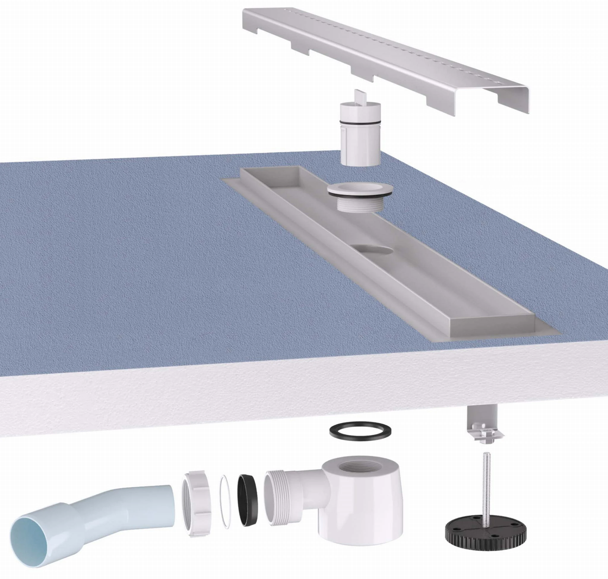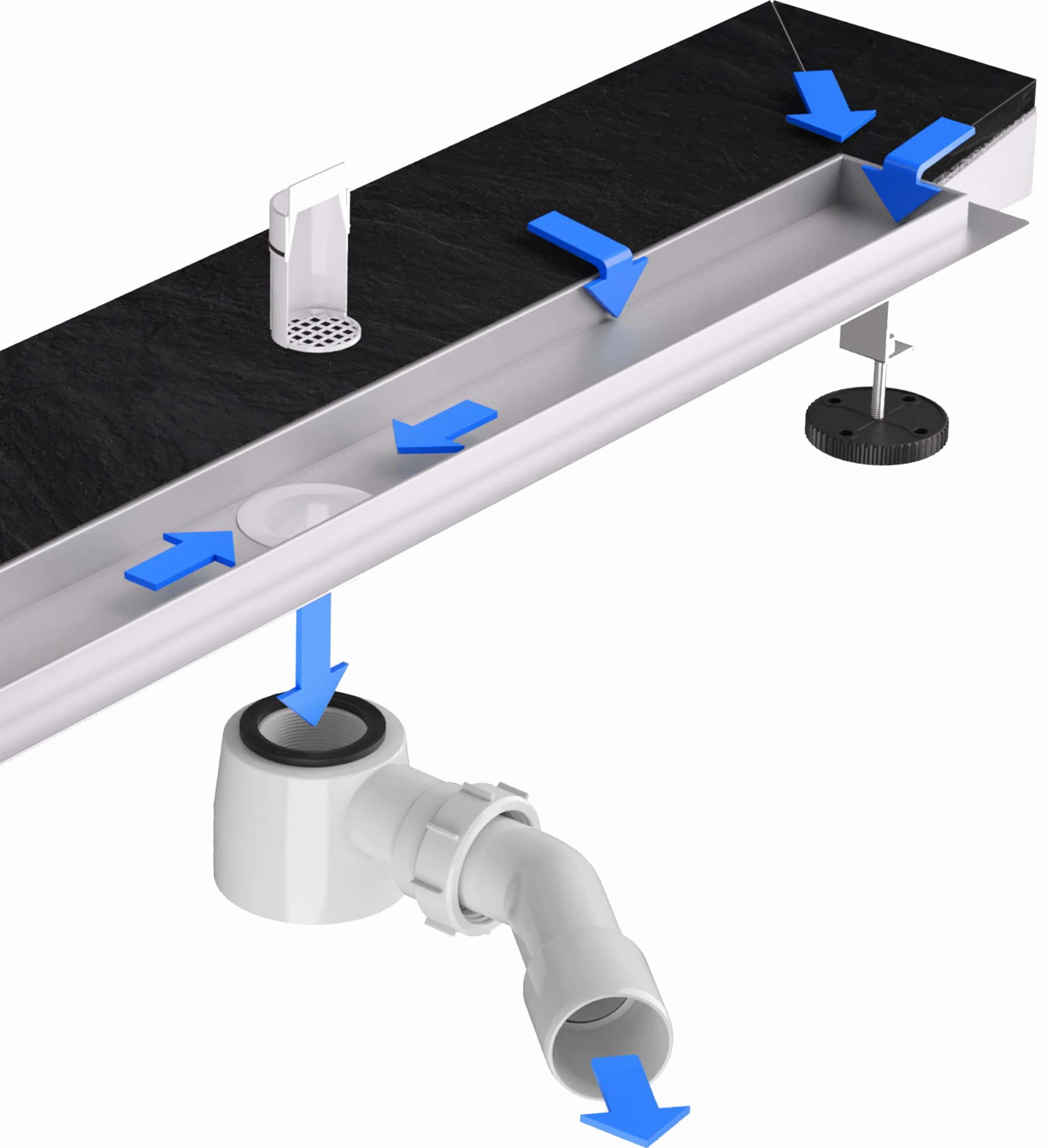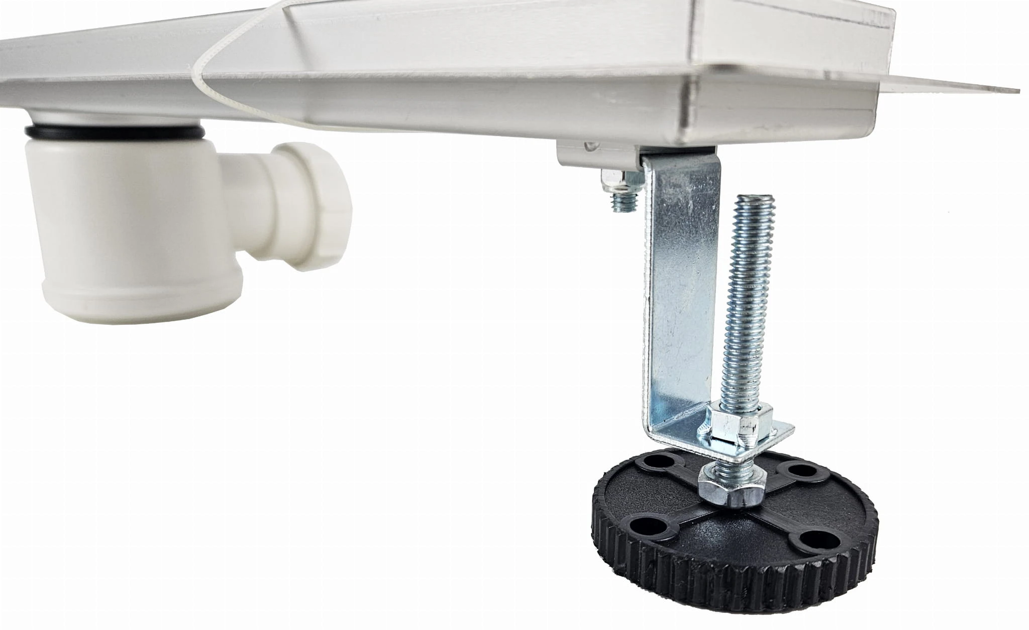 Wykonanie nóżek pozwala na stabilne osadzenie odpływu. Nóżki są regulowane co pozwala na bardzo dokładne wypoziomowanie i zamocowanie odpływu.