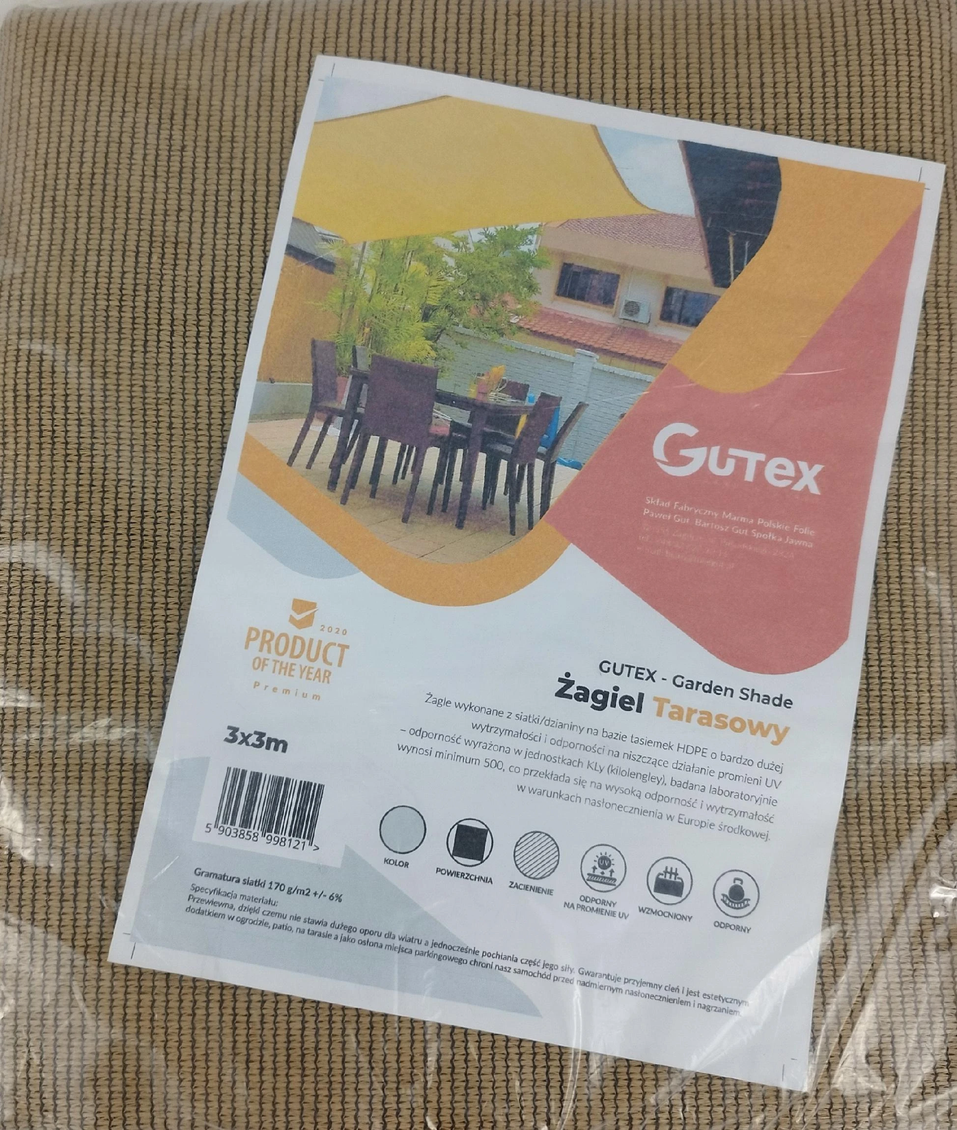 Żagiel Tarasowy Gutex HDPE 3mx3m siatka zacieniająca taras beżowa
