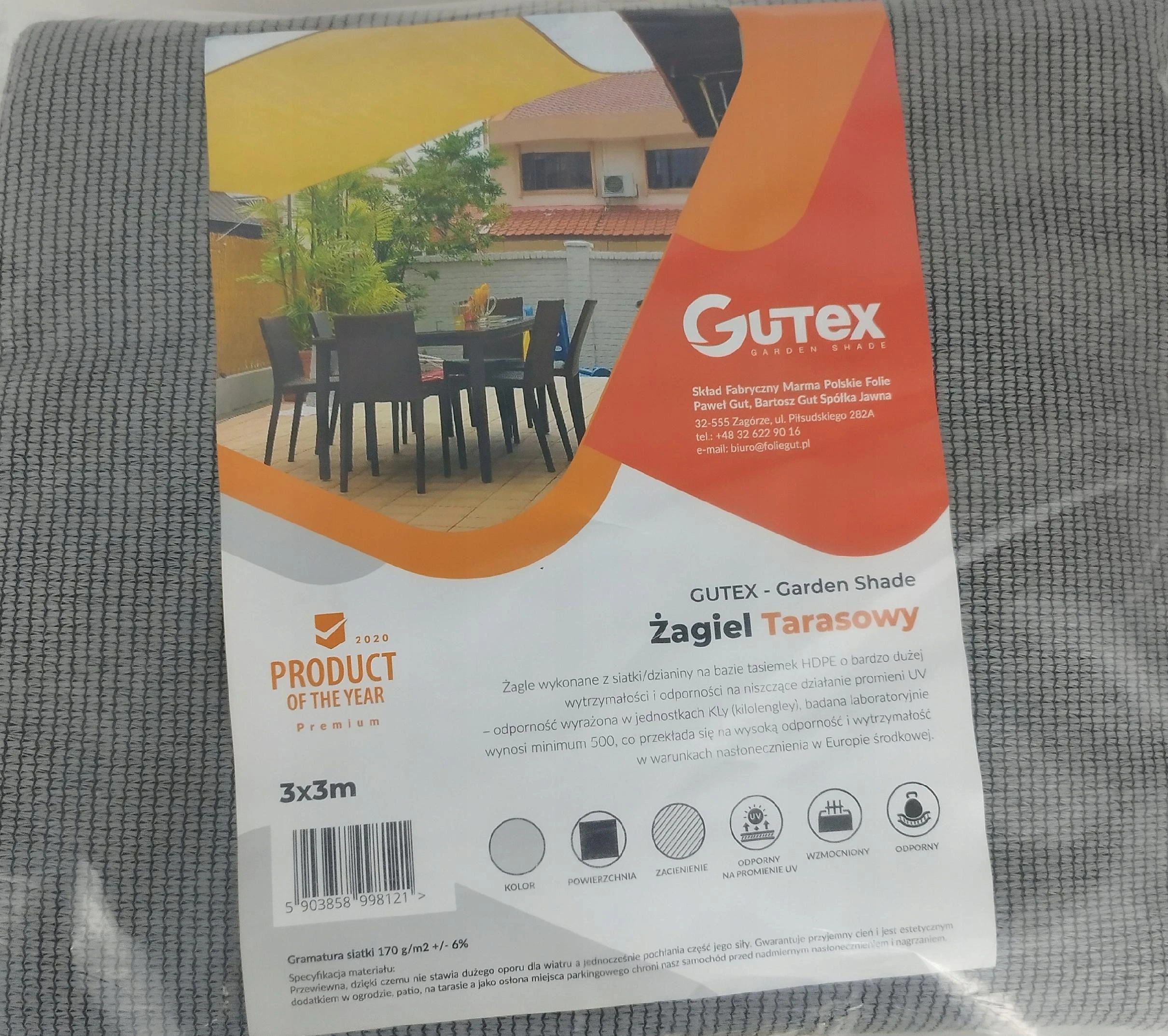 Żagiel Tarasowy Gutex HDPE 3mx3m siatka zacieniająca taras szara